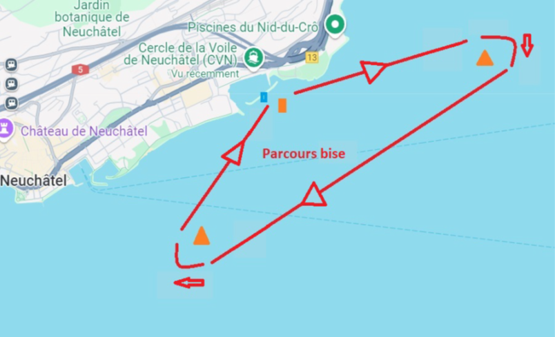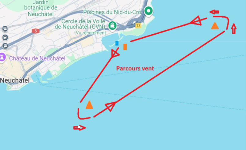 Parcours circulaire avec une ligne de départ vers la cabine start, une bouée au vent et une bouée sous le vent selon esquisse ci-dessous.